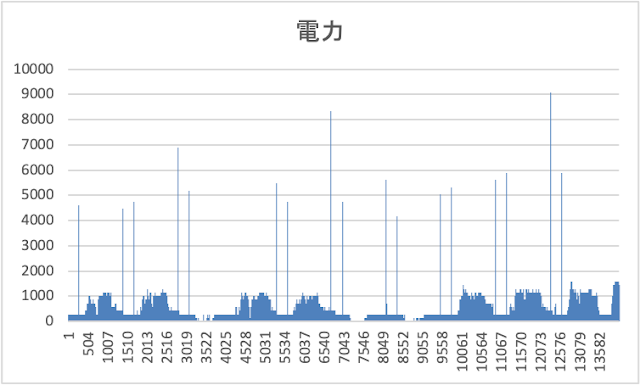 (ノイズではなく計測装置の謎の挙動でした。メータの表示も含めてランダムに校正されている様でカットしたら合計の電力がおかしいので元に戻しました。)